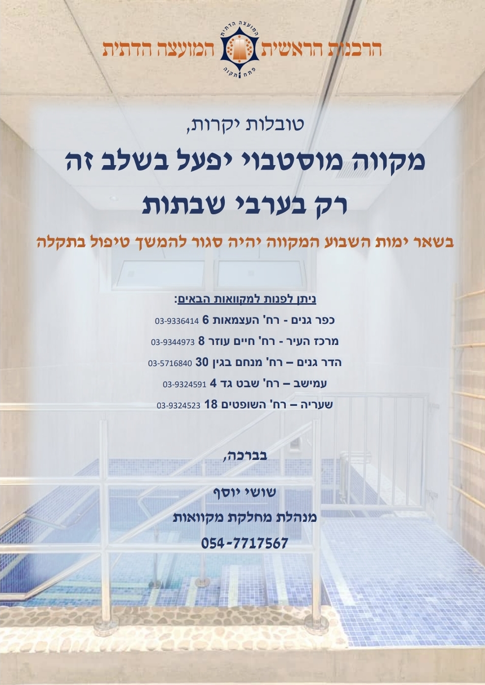 מקווה מוסטבוי יפעל בשלב זה רק בערבי שבתות