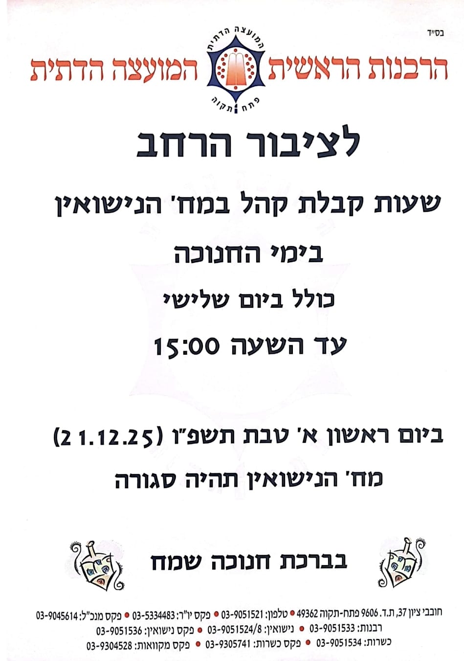 שעות קבלת קהל במחלקת הנישואין בימי החנוכה