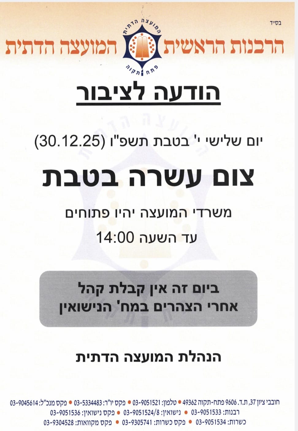 פתיחת משרדי המועצה בצום עשרה בטבת