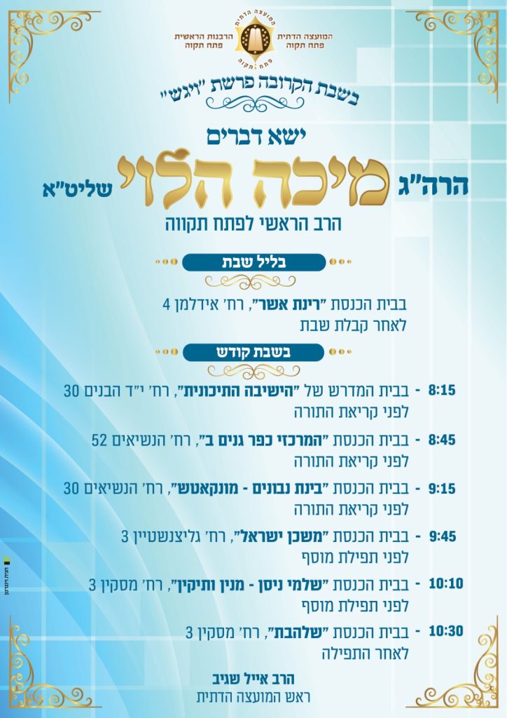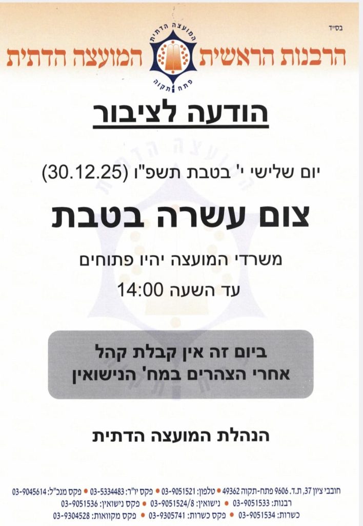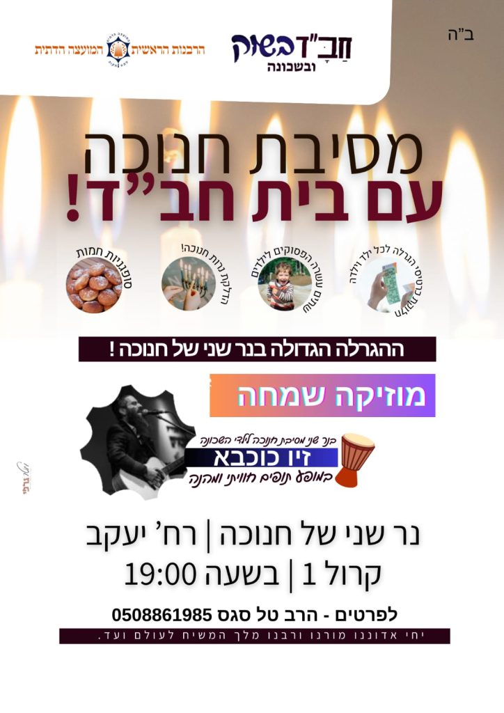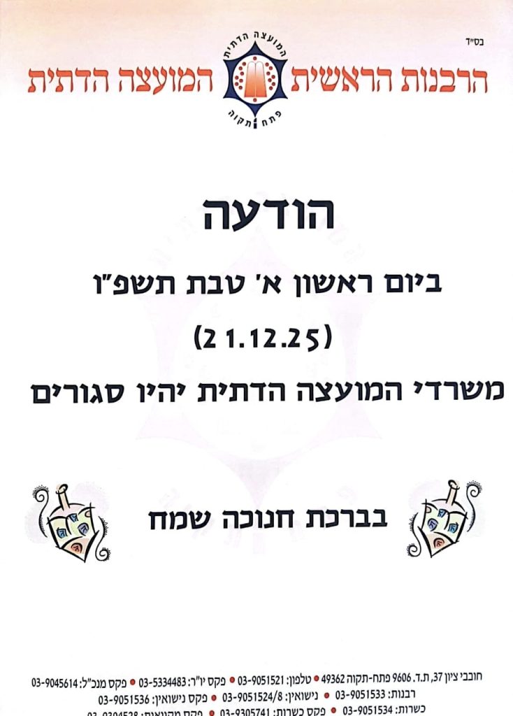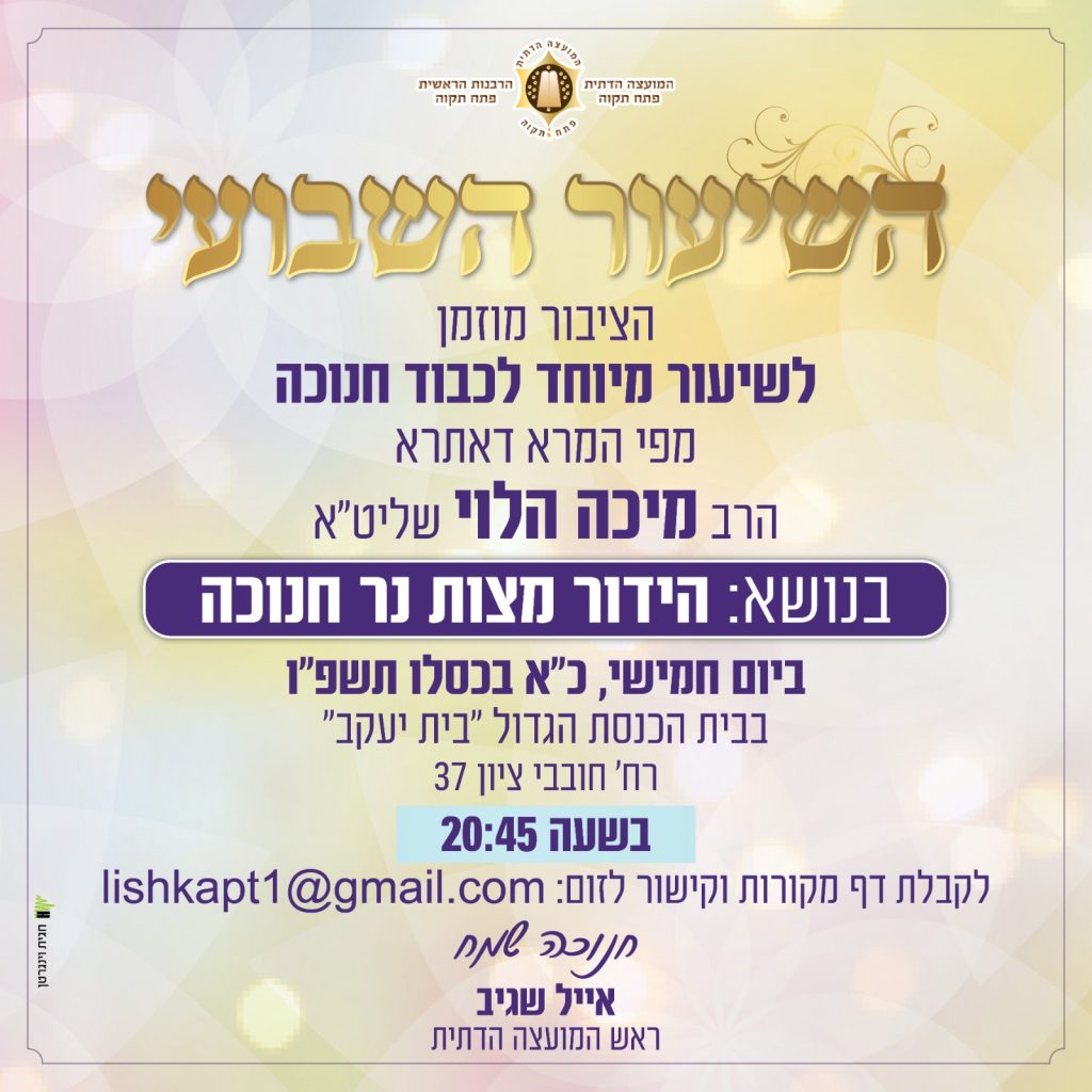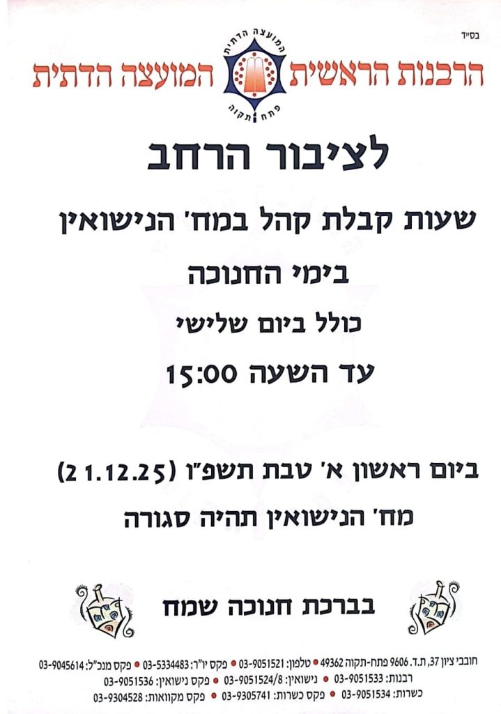 11 דצמ המועצה הדתית בראשות הרב אייל שגיב חילקה מאות ערכות הדלקה לחג החנוכה בבתי הכנסת ברחבי העיר. הרב שגיב הודה לחברי הנהלת המועצה ולגבאי בתי הכנסת על פעילותם המסורה לאורך השנה למען ציבור המתפללים. הוא הדגיש את חשיבות שיתוף הפעולה בין המועצה הדתית לבתי הכנסת בעיר, וכי ערכות ההדלקה מבטאות את האור, השמחה והאחדות שמביא עמו החג. ראש המועצה וחברי הנהלת המועצה מברכים את תושבי העיר בחג חנוכה שמח, ומאחלים להמשיך ולהאיר את בתי הכנסת בתפילות, באחדות ובשמחה לרווחת התושבים ולהצלחת עם ישראל. בברכת חנוכה שמח, המועצה הדתית פתח תקווה קרא עוד